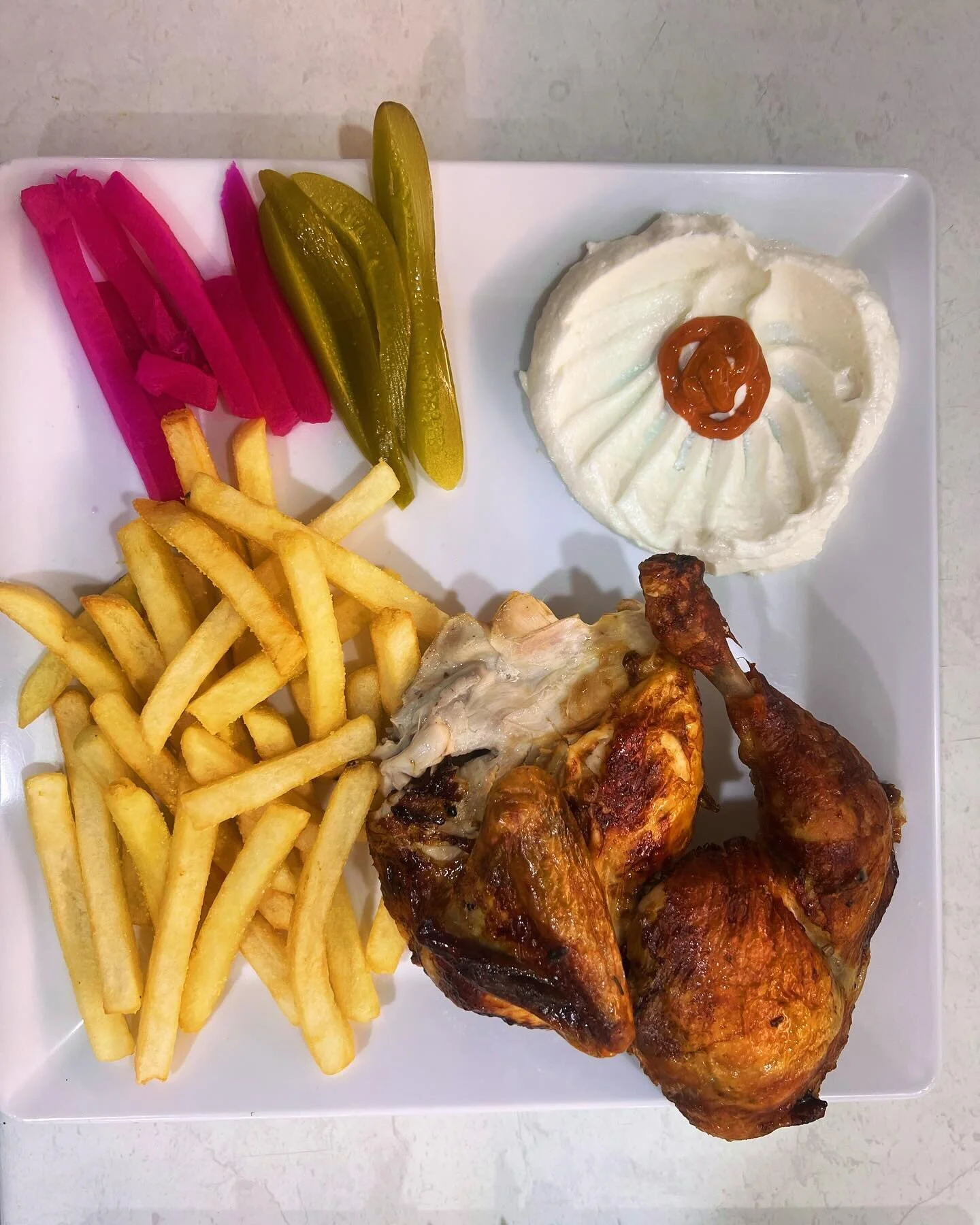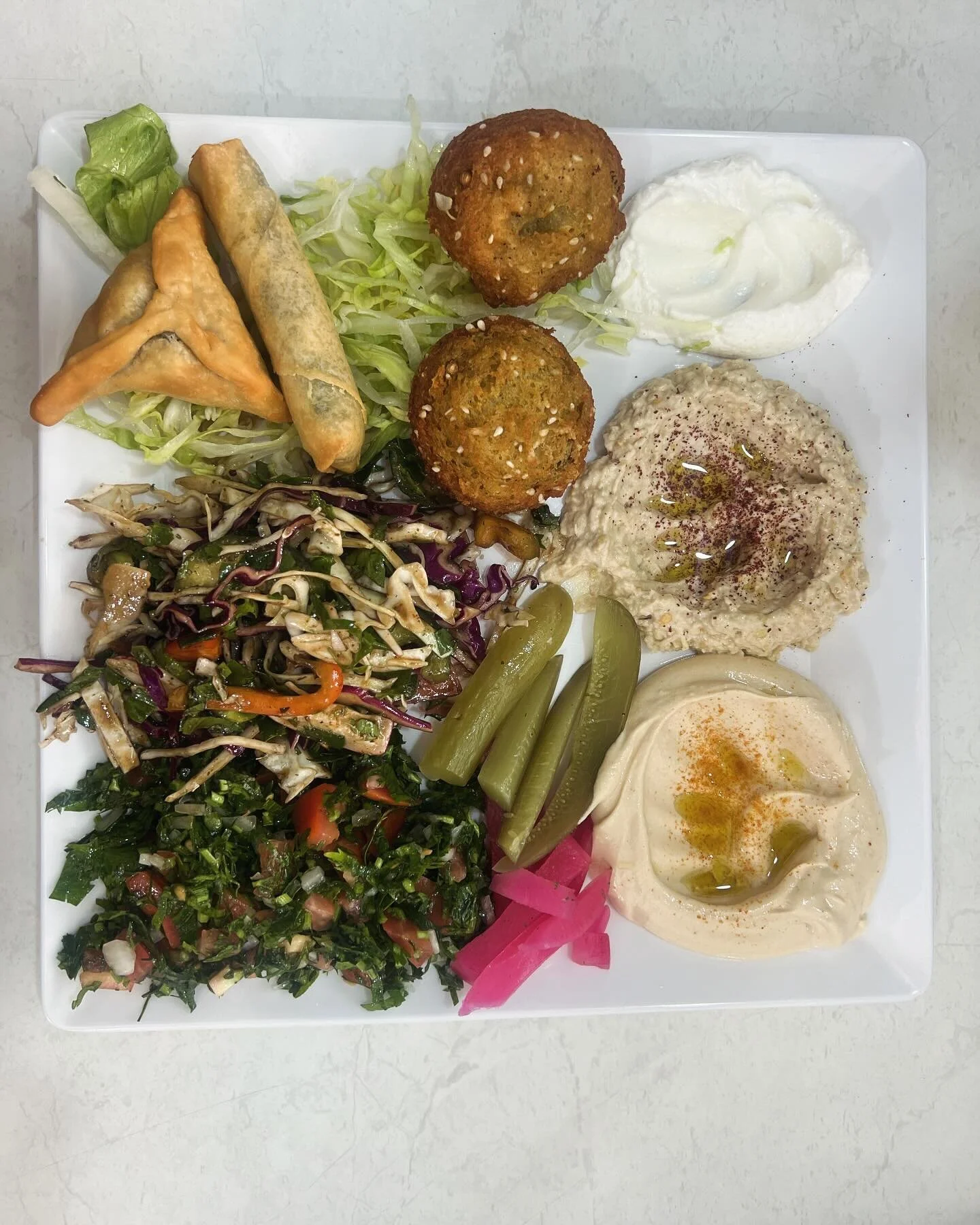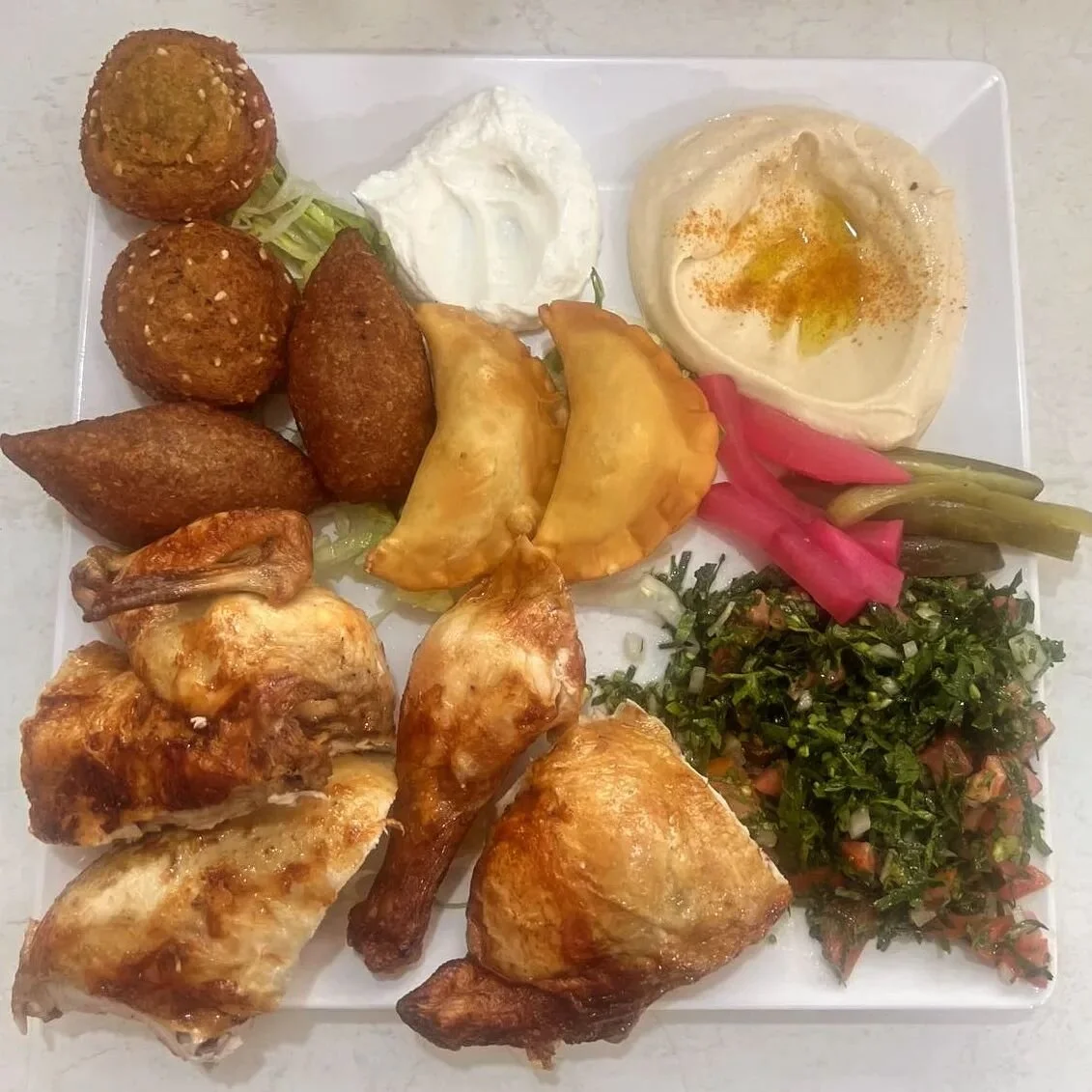 Half chicken, two falafels, two sambousek, two fried kibbeh, tabouli, hummus, pickles, and garlic dip.