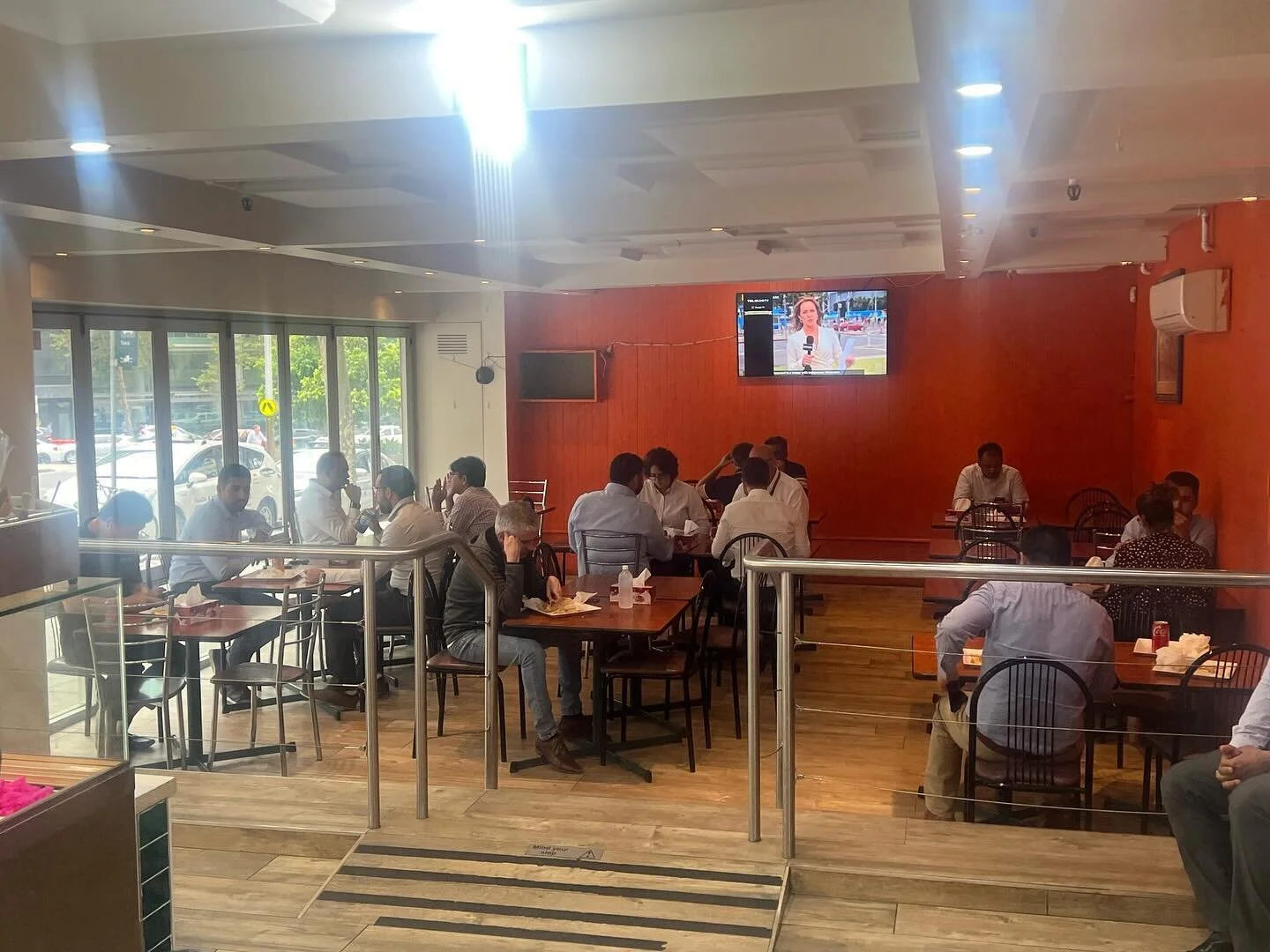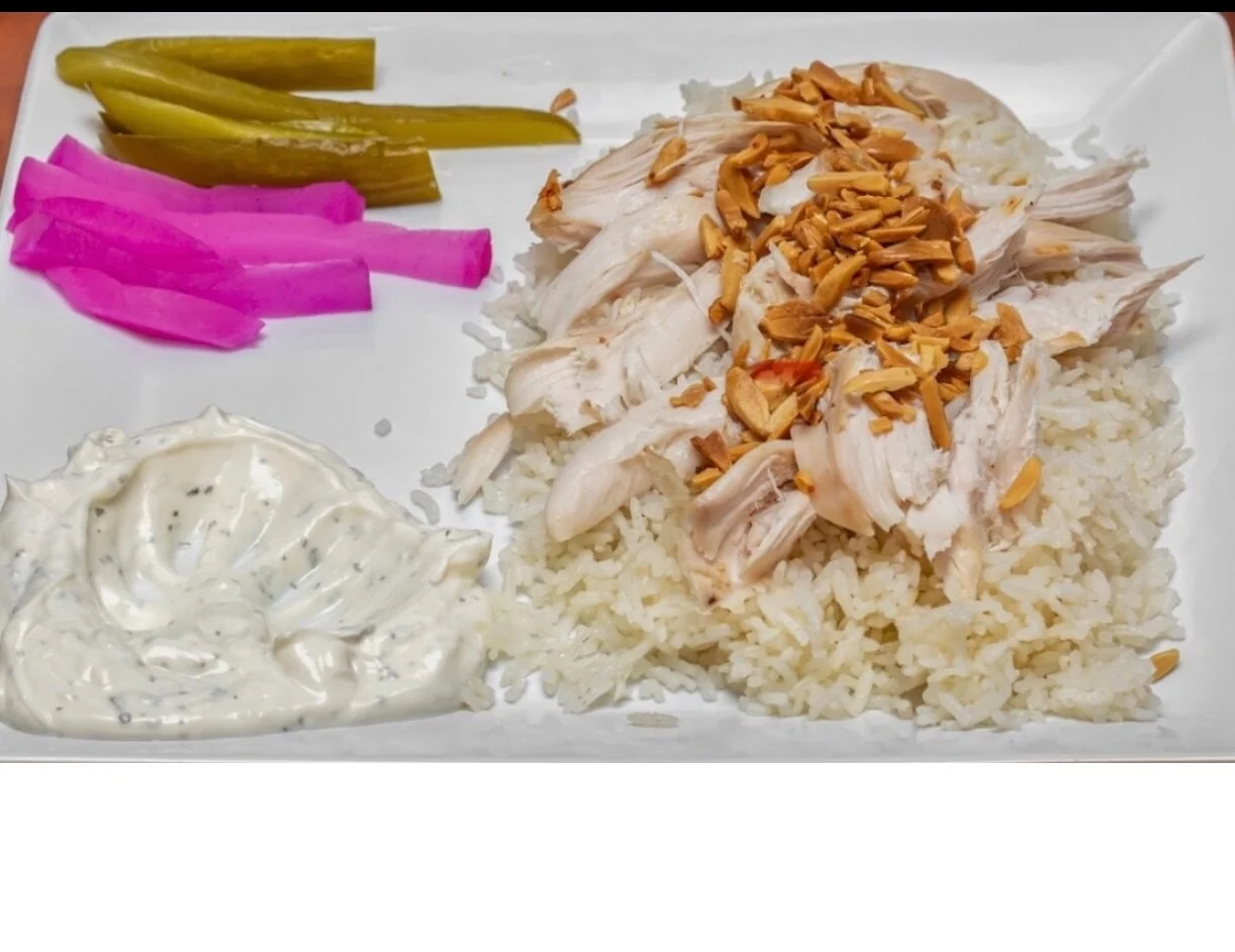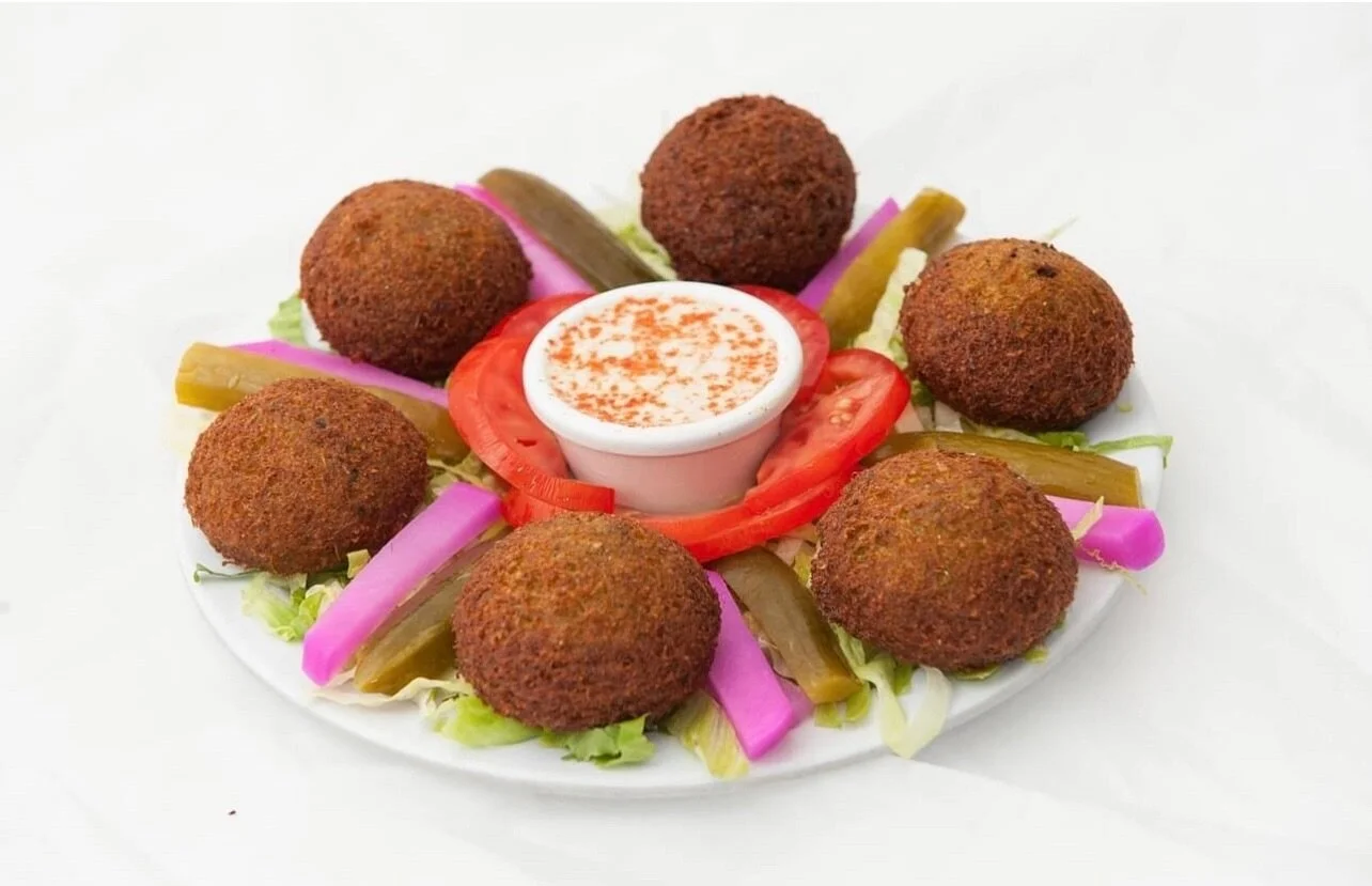 Half chicken, two falafels, two sambousek, two fried kibbeh, tabouli, hummus, pickles, and garlic dip.