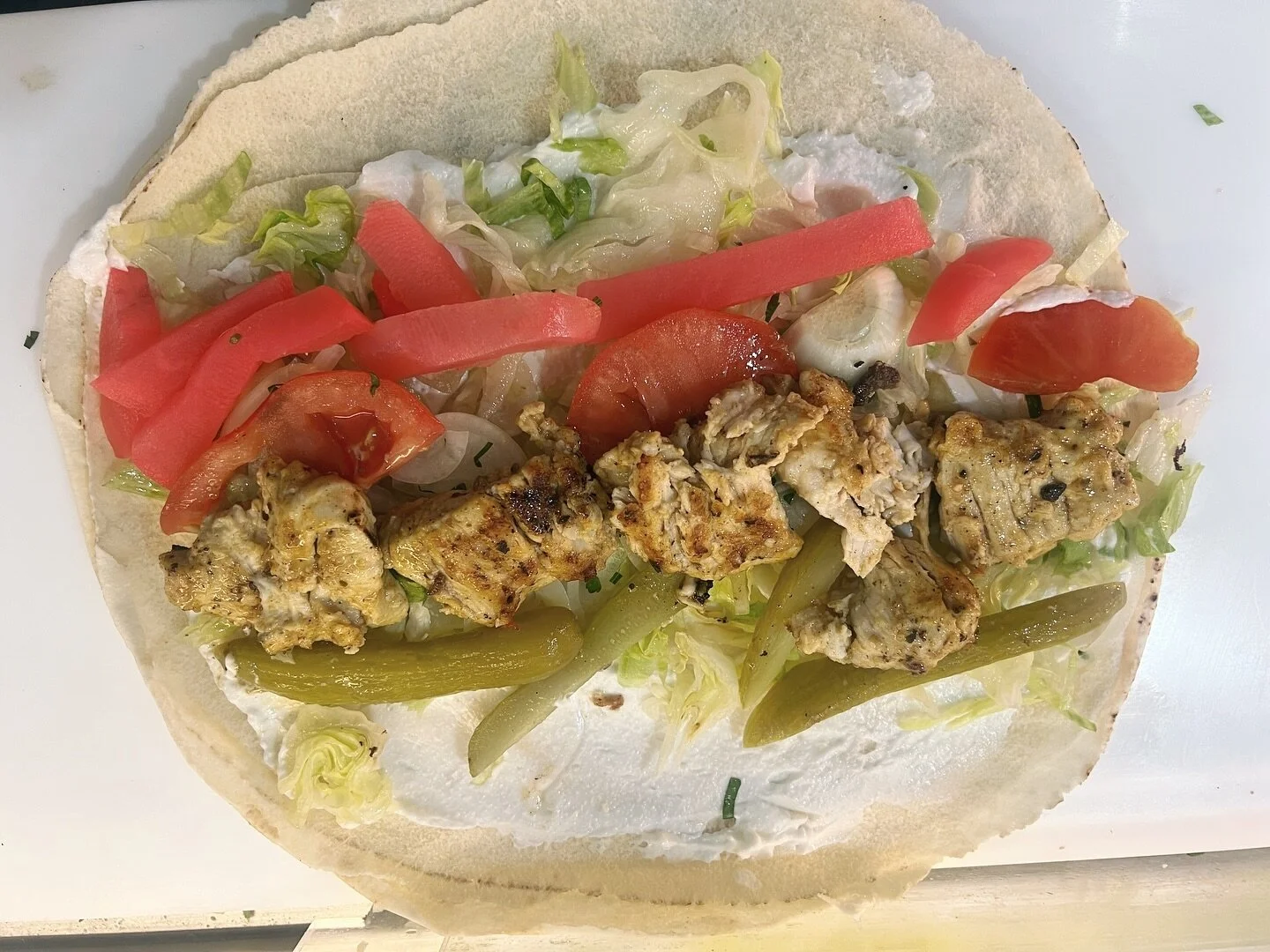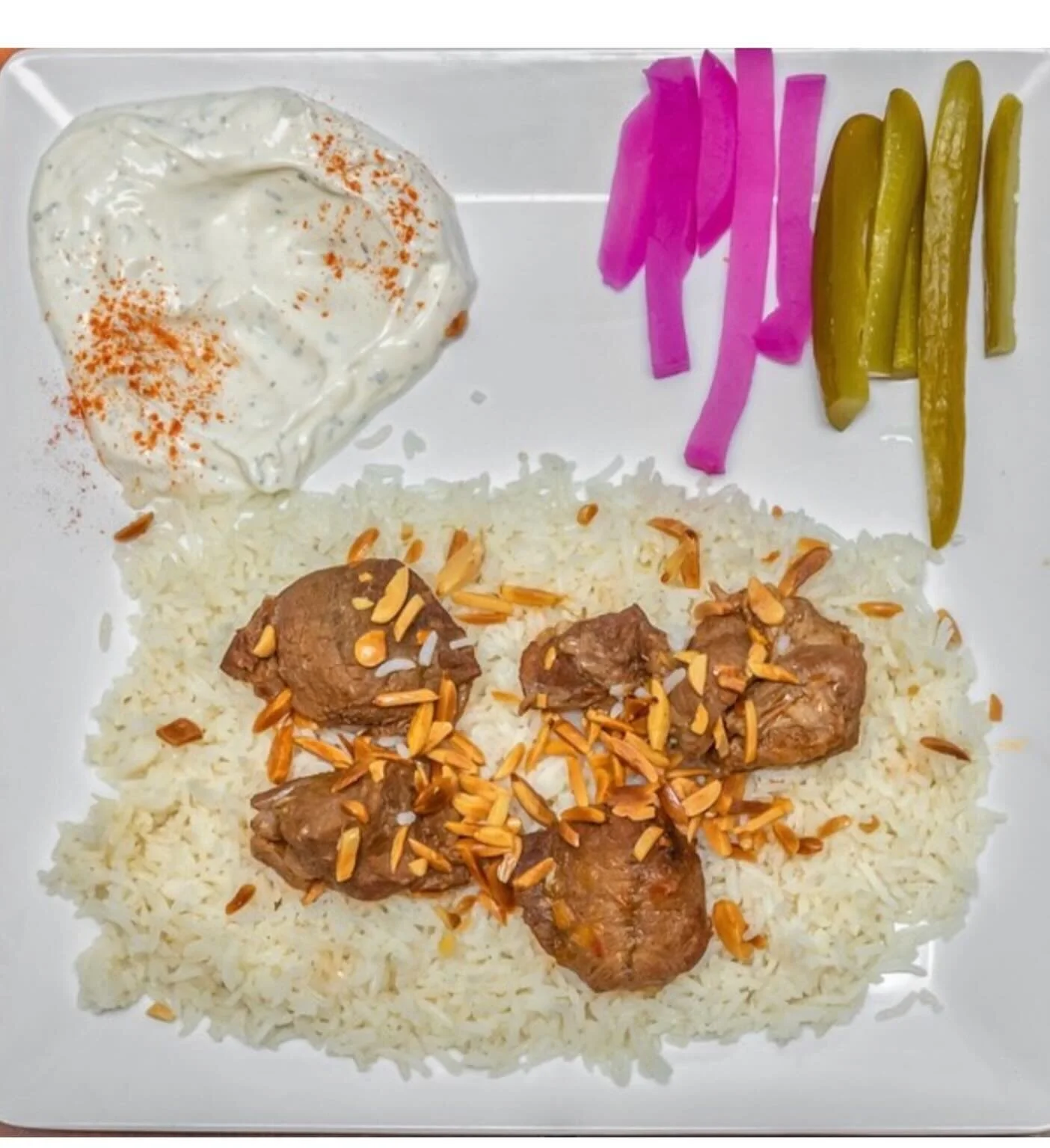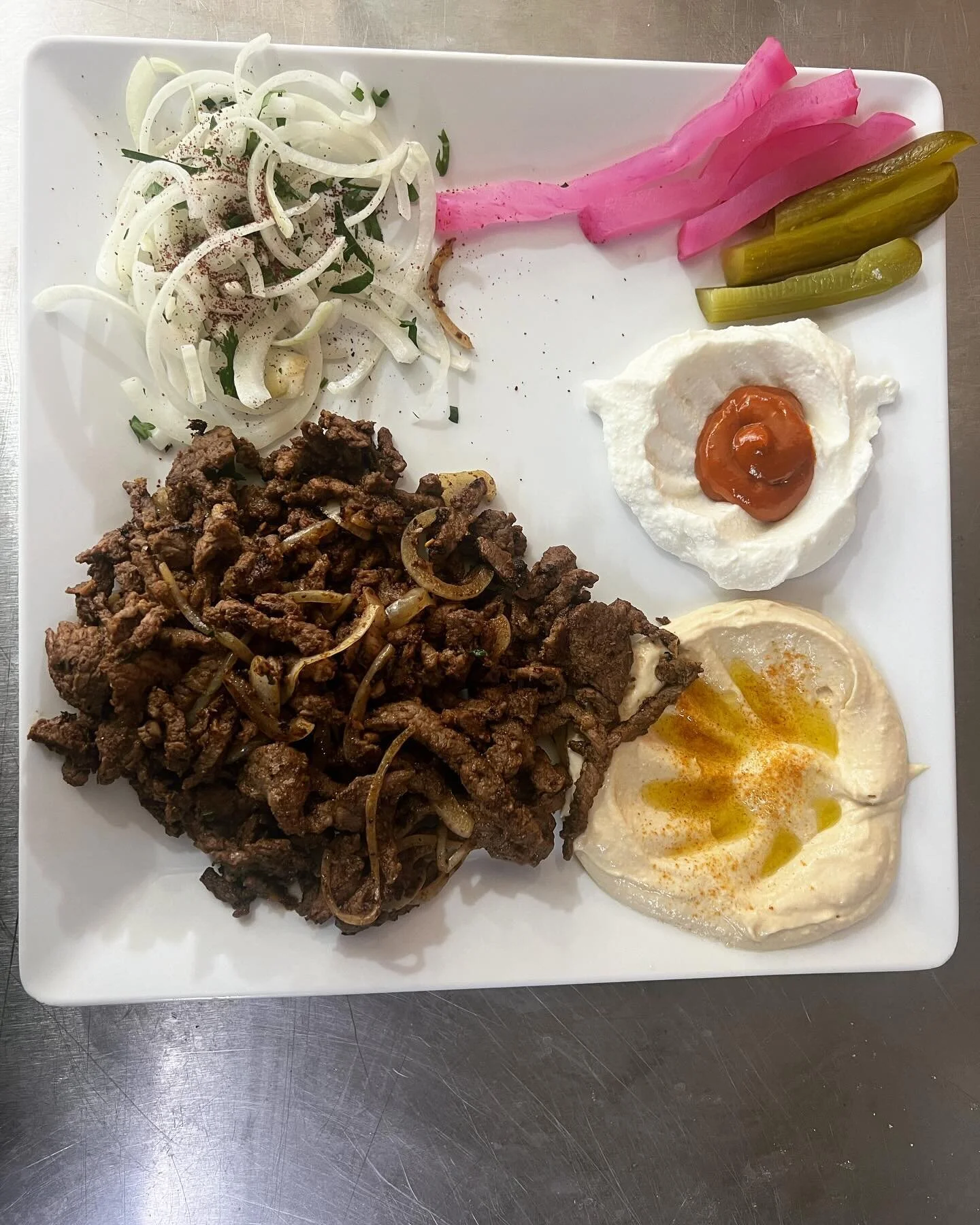 Marinated shredded lamb. Served with tahini sauce, pickles, and bread.