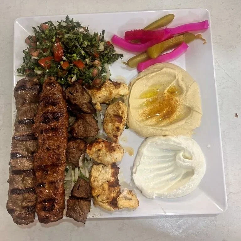 One shish tawook, one kofta, one adana, one lamb skewer, tabouli, hummus, pickles, garlic and bread